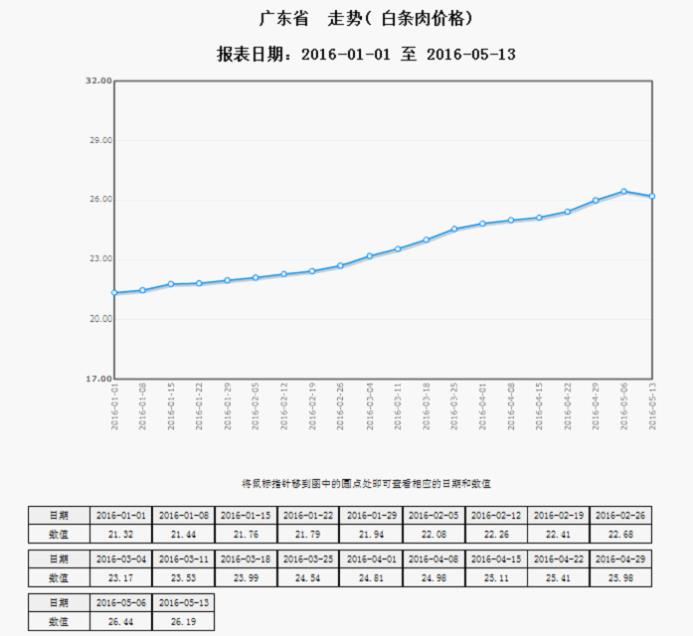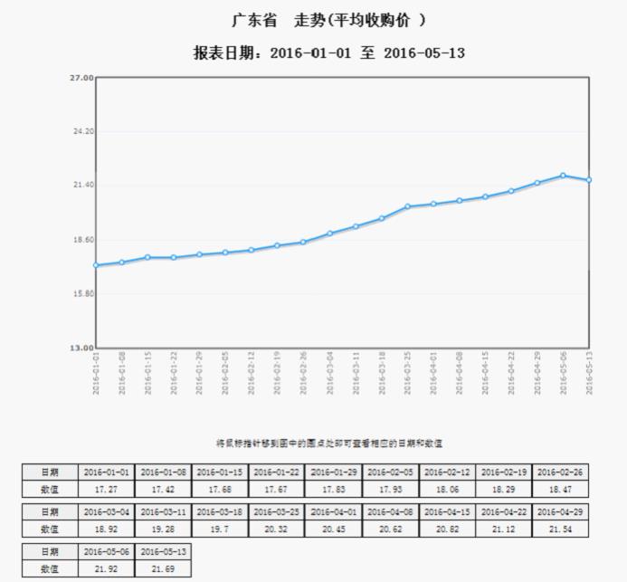 据对广东省101家规模以上生猪定点屠宰样本企业监测统计,2016年5月9-15日,生猪平均收购价格为21.69元/公斤,较前一周下降1.05%,较去年同期上涨44.6%,降幅较大的地区有阳江市2.83%,江门市2.73%,韶关市2%;白条肉平均出厂价格为26.19元/公斤,较前一周下降0.95%,较去年同期上涨38.94%,降幅较大的地区有珠海市2.86%,阳江市2.71%,梅州市2.2%。(畜禽屠宰管理处供稿)