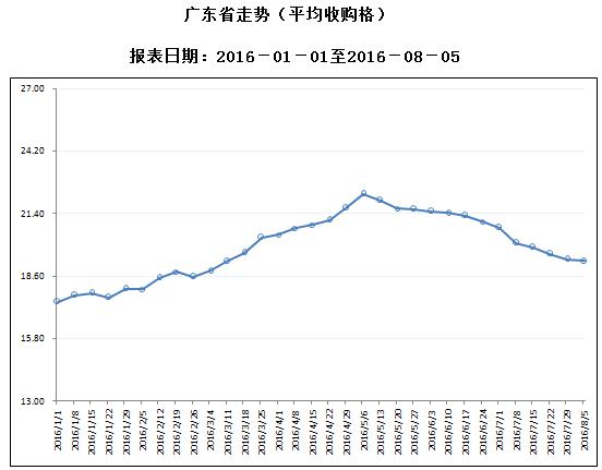 据对全省53家规模以上生猪定点屠宰样本企业监测统计,2016年8月1-8月7日,生猪平均收购价格为19.27元/公斤,较前一周下降0.46%,较去年同期下降3.02%。本周较上周环比降幅较大的地区有云浮市3.55%,东莞市3.3%,河源市2.83%。