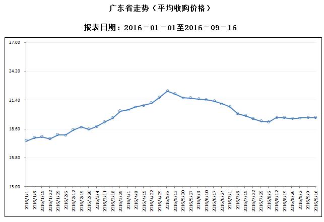 据对全省53家规模以上生猪定点屠宰样本企业监测统计,2016年9月12-18日,生猪平均收购价格为19.69元/公斤,较前一周下降0.05%,较去年同期上涨5.13%。本周较上周环比降幅较大的地区有珠海市2.53%,韶关市1.72%,广州市1.54%。
