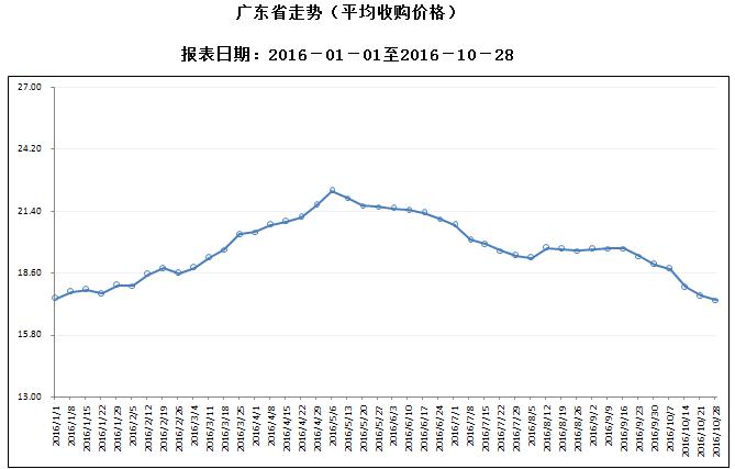 据对全省53家规模以上生猪定点屠宰样本企业监测统计,2016年10月24-30日,生猪平均收购价格为17.37元/公斤,较前一周下降1.03%,较去年同期下降2.20%。本周较上周环比降幅较大的地区有汕头市3.73%,肇庆市3.35%,珠海市2.94%。