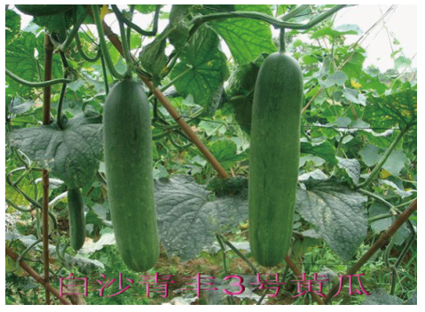 特征特性 : 植株分枝性强,叶片深绿色,主蔓长约 3 ~ 4 米,第一雌花着生于主蔓春季 5.5 节、秋季 9.4 节,座果率高;瓜呈短圆筒形、匀称,鲜瓜皮色绿,瘤小、刺疏、白色,横切面呈圆形,肉质脆,果柄长 1.2 ~ 1.8 厘米,瓜长 23.9 ~ 24.1厘米,横径 5.11 ~ 5.24 厘米,肉厚 1.48 ~ 1.52 厘米,单瓜重 380 ~ 450 克。早熟,播种至初收春播约 66 天、秋播约 43 天,连续采收期 26 ~ 35 天;田间表现耐寒性、耐热性和耐旱性强,耐涝性中等, 抗霜霉病, 中抗枯萎病;肉质脆、 风味微甜, 品质优;雌性花多,坐果能力强,商品率高。