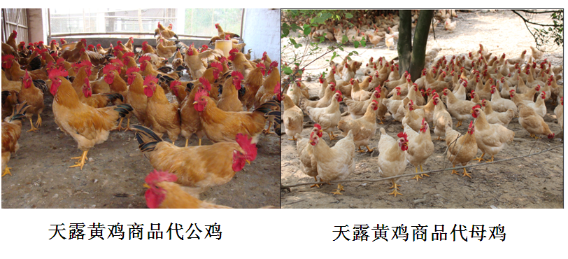 特征特性 父母代种鸡性能优秀,27周达产蛋高峰,高峰产蛋率达到83%,66周龄入舍母鸡只产蛋量165-174个,全期种蛋合格率93.6%-94.5%,全期种蛋受精率94.0%-95.2%,全期受精蛋孵化率92.1%-93.0%,66周龄入舍母鸡只产合格种苗133-141只。商品代肉鸡在保持原有广西三黄鸡优良肉质的基础上,生产性能也有显著的提高。其中商品代公鸡84日龄前后上市,冠大鲜红,羽毛紧凑,毛色浅黄色,体重1450-1550g,胸肉饱满,胸肌率14.5%-15.5%,腿肌发达,腿肌率28.1-28.8%,饲料转化比2.9-3.0:1,成活率95%以上。母鸡105日龄上市,体型团圆,胸腿肌较发达,胸肌率15.5%-16.1%,腿肌率26.9%-27.5%,毛色米黄色,体重1400-1500g,饲料转化率3.5-3.6:1,成活率95%以上。