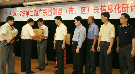 6月29日下午,广东省农业厅与广东省信息产业厅在肇庆鼎湖举行联合授牌颁证仪式,授予10家广东省农村信息化示范单位、22家广东省农村信息化试点单位农村基层信息化建设、镇(村)信息化、农业产业化信息化、行业电子商务应用和农业专家系统建设试点示范牌匾,授予544位基层农业科技咨询专家聘认证书。这是省信息产业厅与省农业厅为贯彻《关于2006年到2010年广东省信息化发展纲要的实施意见》,全面落实《印发<关于整合资源,联合共建农业信息服务体系的合作方案>的通知》,联合组织实施的全省农村信息化试点示范建设工作及聘认农村信息化农业科技咨询专家工作。目前,这两项工作的推荐、评审、发文等工作均已完成。图为省信息产业厅邹生副厅长(左一)和省农业厅信息中心黄建民主任(左二)向代表们授牌。