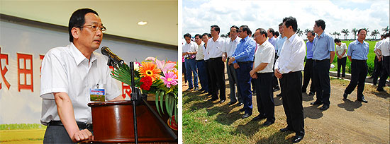 与会代表参观了廉江市、雷州市现代标准农田建设和粮食高产创建现场,图左为农业厅谢悦新厅长在会上发言。