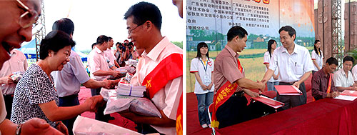 活动日上午尽管下着大雨,但并没有影响来自增城附近的近一千五百多名农民特别是青年农民前来参加活动。主办单位为此次活动带来了众多支农惠农的书籍、种子和化肥,赠送给现场农村青年,建立了农科专家与农村青年协会的结队帮扶机制。同时,广东农村青年致富带头人还向全省农村青年发出“推动广东‘双转移’ 农村青年当先锋”的倡议,号召广大的农村青年争当解放思想、转变观念的先锋,争当本领过硬、敢闯敢试的先锋,争当自主创业、增收致富的先锋,争当倡树新风,优化环境的先锋。