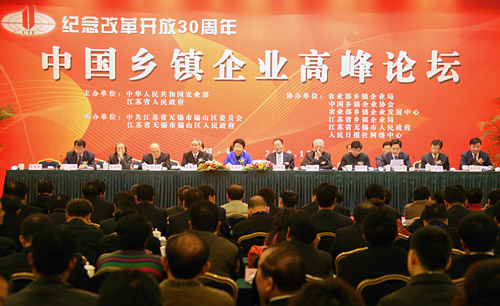 本网讯:12月9日,农业部和江苏省人民政府在乡镇企业的发祥地——无锡市锡山区联合召开庆祝改革开放30周年中国乡镇企业高峰论坛。中共中央政治局委员、国务院副总理回良玉专门发来贺电。