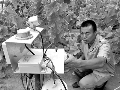 技术人员在河北永清县一家农产品产业园检查数据监控传感器,该产业园构建智能种植体系,带动50万亩蔬菜基地实现智慧转型。