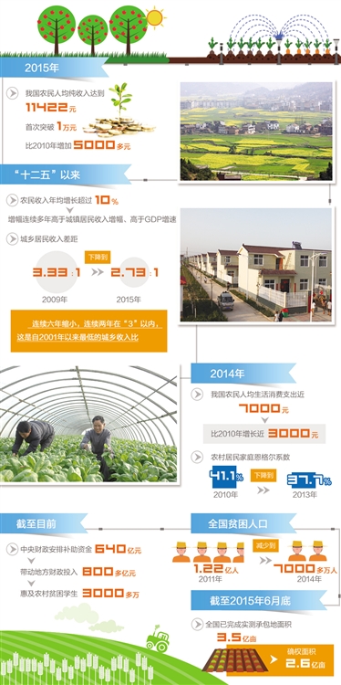 现实中,衡量农民收入是否实现快速增长有两个参照:一是看收入增速是否超过 同期GDP的增速,二是看收入增速是否超过城镇居民收入增速。“十二五”以来,农民收入年均增长超过10%,增幅连续多年高于城镇居民收入增幅、高于 GDP增速。城乡居民收入差距由2009年的3.33∶1下降到2015年的2.73∶1,连续六年缩小,连续两年都在“3”以内,这是自2001年以来 最低的城乡收入比。
