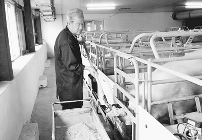 本报记者蒋建科正在为母猪加料。 郑永平摄