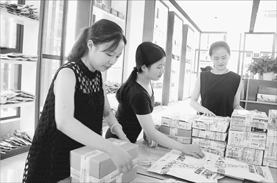 图为万山区电商生态城工作人员正在包装土特产。