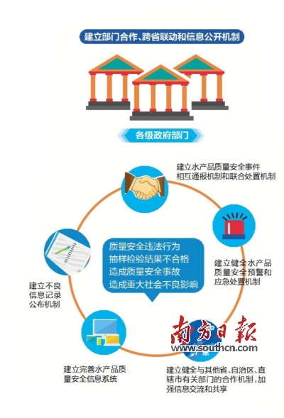 在加强部门联动和信息公开方面,《条例》提出建立省内部门联动应急机制和跨省联合监管机制,县级以上人民政府渔业行政主管部门、食品药品监督管理部门以及出入境检验检疫机构等相关部门应当建立水产品质量安全事件相互通报机制和联合处置机制,建立健全水产品质量安全预警和应急处置机制,制定应急预案,协调做好水产品质量安全事故应对处置工作。