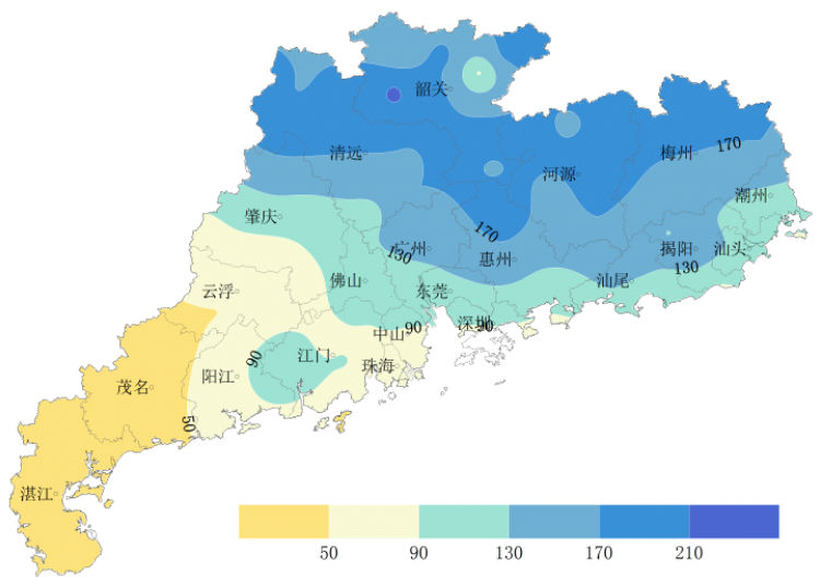 降水:全省平均月雨量118.2毫米,较常年同期偏多1.7倍。月雨量分布(图2):北部大部170~216.5毫米,西南大部14.5~90毫米,其余大部分地区90~170毫米。与常年同期相比,东北、东南大部偏多2~3.8倍,湛江、茂名局部正常~偏少4成,其余大部分地区正常~偏多2倍。月雨日大部分地区为8~12天。