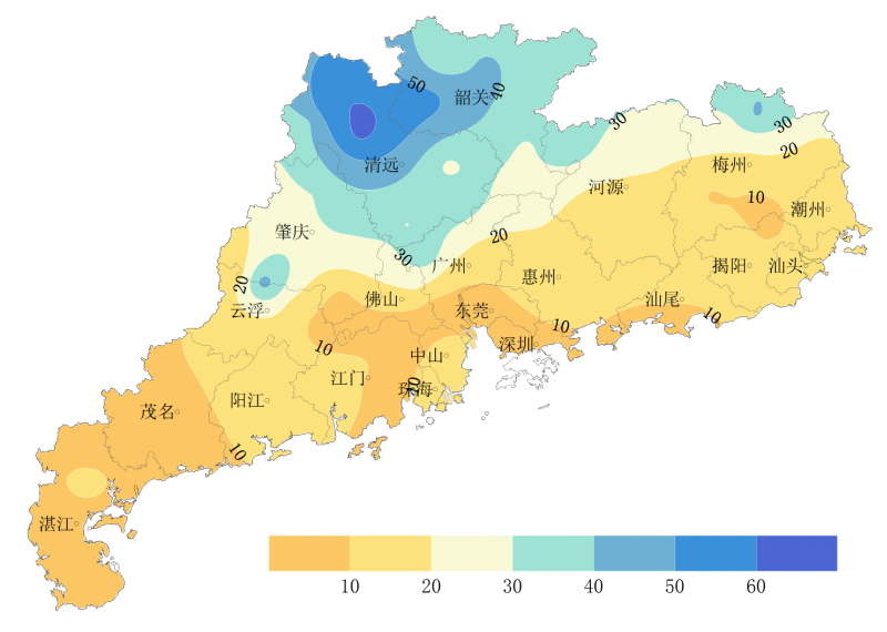 日照:全省平均月日照时数102.2小时,较常年同期偏多近3成。月日照时数分布:除西北局部、东南局部、广州、佛山局部地区110~139.0小时外,其余地区62.6~110.0小时。与常年同期相比,雷州半岛、东南局部地区正常到偏少3成以上,西北大部、中部局部地区偏多5成到1倍,其余大部分地区正常到偏多5成。