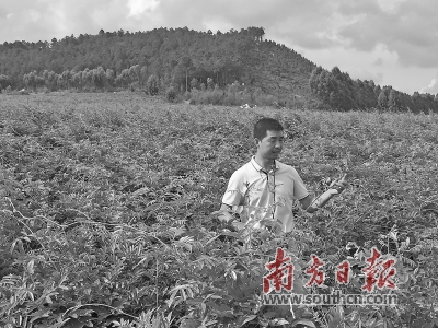 黄创尚观察种植基地内牛大力生长情况。受访者供图