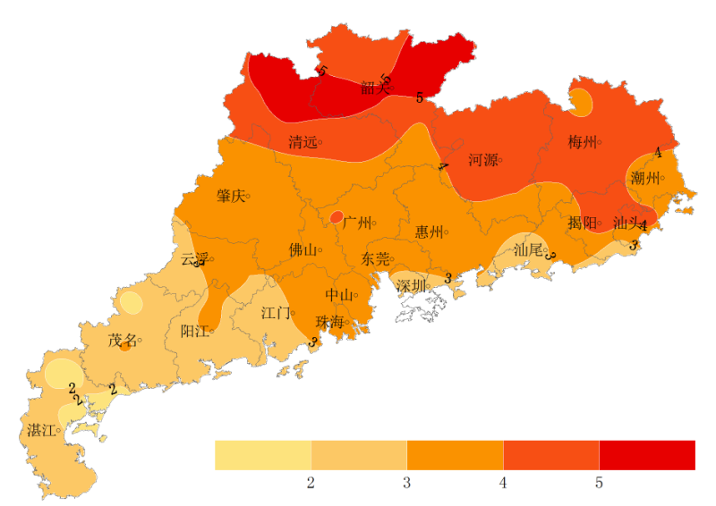 上周(5月14-20日),全省平均气温28.9℃,较常年同期偏高3.6℃,西南局部、珠江口两岸、东部局部和北部偏北29.0~30.0℃,其余大部分地区28.0~29.0℃(图1),与常年同期相比,北部偏高4.0~5.7℃,西南大部偏高2.0~3.0℃,其余大部分地区偏高3.0~4.0℃(图2),79%的站点平或破有记录以来同期最高值记录;全省平均累计降水量仅5.1毫米,较常年同期偏少9成,49%的站点滴雨未落,遂溪降水量105.4毫米,为全省最大(较常年同期偏多近8成),广-佛-肇庆-云浮局部出现20~37.6毫米降水;全省平均累计日照时数64.9小时,较常年同期偏多近1.2倍,南部沿海70~80小时,西北偏南局部39.8~60小时,其余大部60~70小时。
