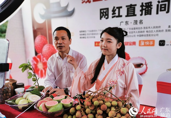 茂名市化州市代市长邓泽友(左)在直播间推介荔枝。 茂名市委宣传部供图