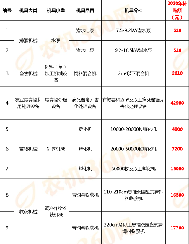 在畜牧机械中,孵化机的补贴金额有较大变化。2018年孵化机的补贴分两等,蛋容量在1万-5万枚的孵化机补贴4800元,蛋容量超过5万枚的补贴15000元。在2020年,将孵化机补贴分档调整为三档,其中,蛋容量在1万-2万枚的孵化机补贴4800元,蛋容量在2万-5万枚的孵化机补贴7200元,蛋容量超过5万枚的补贴金额仍为15000元。