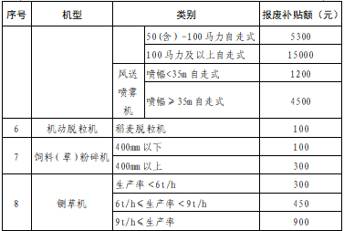 补贴报废农机种类为《农业机械安全监督管理条例》规定的危及人身财产安全的农业机械,包括拖拉机、联合收割机、水稻插秧机、机动喷雾(粉)机、机动脱粒机、饲料(草)粉碎机、铡草机,报废补贴从100到17500元不等。