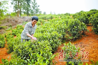 粤财控股扶贫点黄洞村,农户刘贵英在采摘茶叶。