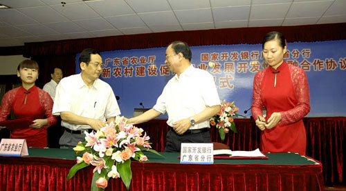 8月13日上午,广东省农业厅与国家开发银行广东省分行在穗举行“十一五”期间支持社会主义新农村建设、促进农业发展开发性金融合作协议签字仪式。广东省农业厅谢悦新厅长、国家开发银行广东省分行戴达年行长代表双放在协议上签字并作了讲话。双方表示,在农业农村领域开展开发金融合作是我省新农村建设在融资方面采取的一项标志性行动,有利于充分发挥政府部门的组织协调优势和开发银行的融资优势,打通我省农业发展、农村建设的融资渠道,为社会主义新农村建设注入动力。
