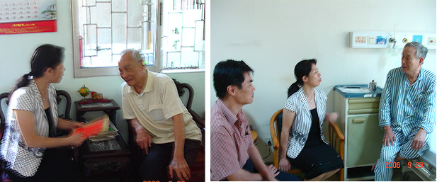 9月29日下午,在举国纪念红军长征胜利70周年之际,省农业厅余俭娥副厅长与老干处、人事处负责人一行上门慰问了老红军方学同志,并送去慰问金和慰问品(图左)。同时还前往医院,看望了正在那里住院治疗的抗战时期老干部、原农业厅厅长许士鉴同志,并送去了慰问品(图右)。