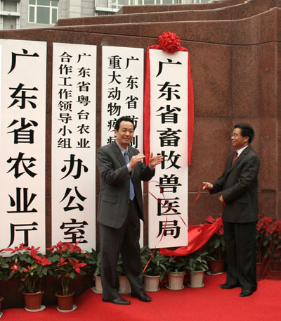 图为省农业厅谢悦新厅长(左)和陈福林副厅长为广东省畜牧兽医局挂牌