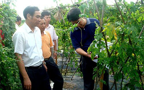 图为蔡汉雄副厅长和梁友强站长在察看苦瓜“3414”田间肥效小区试验