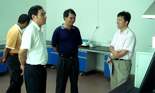 图为蔡汉雄副厅长和梁友强站长在实地察看南海区测土配方施肥化验室