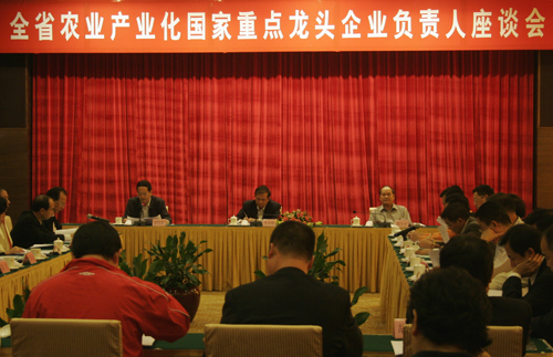 座谈会上,省农业厅谢悦新厅长通报了近年我省推进农业产业化经营的工作情况,并提出了下一阶段推进农业产业化经营的“五新”工作思路:即建立分层次推进农业龙头企业发展的新格局,探索财政资金扶持农业龙头企业的新机制,支持农业龙头企业“走出去”开拓新市场,鼓励有条件的企业上市开辟融资新渠道,开创农业龙头企业联接各种经济实体的新形式。