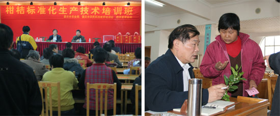农业专家现场开展培训讲座,介绍柑桔标准化等生产技术。