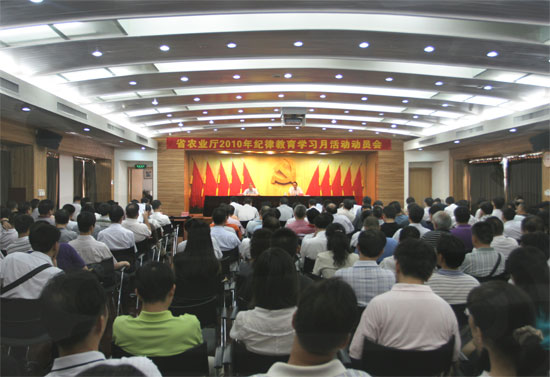 8月9日上午,广东省农业厅召开纪律教育学习月活动动员大会,会议由省纪委、省监察厅派驻机构正厅级纪检员、监察专员张小沙同志主持,省农业厅厅长谢悦新同志在会上发表重要讲话。会议传达了省委十届七次全会精神,认真学习了汪洋书记、黄华华省长在全省第九期党政领导干部“三纪班”上的重要讲话精神,部署今年农业厅党员干部开展纪律教育学习月活动的有关工作。省农业厅领导,厅机关各处室,厅机关大院内事业单位全体干部,大院外事业单位副科级以上干部约300人参加动员会议。