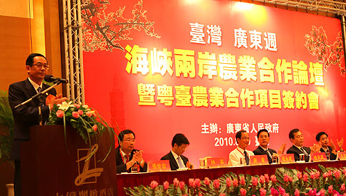 广东与台湾气候相似,人缘相亲,语言相通,习俗相近,人员来往密切,粤台农业合作基础扎实。广东在市场、劳动力成本、土地资源等方面优势明显,台湾农业在技术、资金、产品研发、加工、市场营销等方面优势突出,广东与台湾农业经济互补性强,农业合作发展潜力巨大。2009年,广东与台湾贸易总额达到386亿美元,约占祖国大陆与台湾贸易总额的1/3强。其中,农产品贸易保持强劲增长,农产品贸易总额达1.15亿美元,同比增长18.1%。在这次活动中,粤台双方签订了粤台农业交流合作框架协议,两地企业签订了采购台湾农产品20项合同,金额达8581万美元,其中上台签约项目17个,合同金额8467.4万美元。