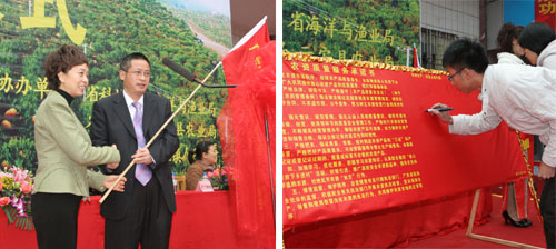 副厅长程萍为农科人员科技服务行动授旗(左),企业现场签订不经营假冒伪劣农资倡议书