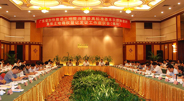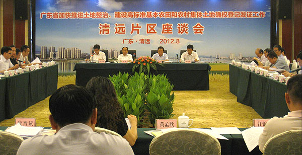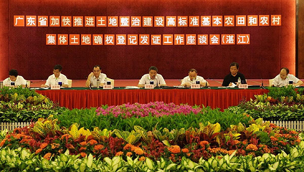 为加快推进土地整治,大规模建设高标准基本农田和推进农村集体土地确权登记发证工作,广东省政府先后于2012年8月9日、10日、13日在全省分5个片区召开加快推进土地整治、建设高标准基本农田和农村集体土地确权登记发证工作座谈会。各地级以上市及顺德区副市长、各县(市、区)政府主要负责人,国土资源局、财政局、农业局主要负责人参加会议。