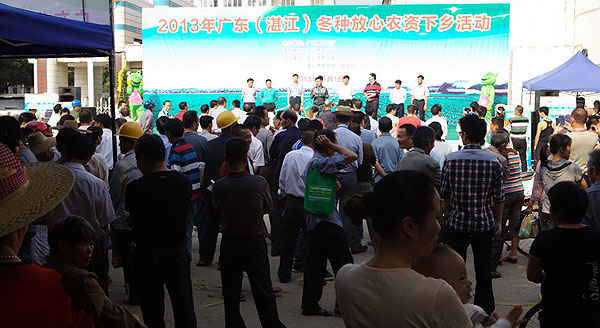 11月1日,由广东省农业厅主办、湛江市农业局承办、雷州市农业局和雷州市客路镇政府协办的“2013年广东(湛江)冬种放心农资下乡进村活动”在雷州市客路镇举行。省农业厅农产品质量安全处调研员张锦生,湛江市农业局党组书记陈康华、纪检组长陈新,局党组成员、副调研员杨志才、雷州市副市长梁锦等出席活动。陈康华书记致辞,农资经销商代表——湛江粤联绿色作物科技服务有限公司总经理罗志林和农民代表——客路镇绿富农民专业合作社经理梁友分别发言,张锦生调研员宣布“2013年广东(湛江)冬种放心农资下乡进村活动”开幕。现场活动吸引了2万多农民群众参观。