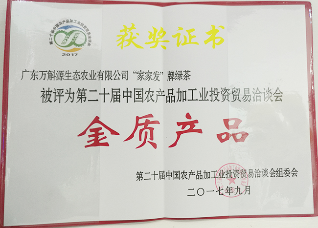 此外,本届农加工洽谈会共评选出金质产品30个、优质产品142个,其中,广东省广东万斛源生态农业有限公司的“家家发”绿茶荣获大会“金质产品”奖,平远源丰农业发展有限公司“石正金红”牌有机红茶获得大会“优质产品”奖。