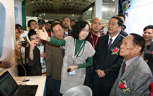 “中国杂交水稻之父”袁隆平院士(中)在谢悦新厅长等人的陪同下参观展览现场