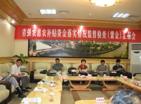 5月9日至11日,广东省农业厅强农惠农富农政策第三检查组在省纪委、省监察厅派驻省农业厅纪检组副厅级纪检员、监察员冼少文同志的带领下,到河源市开展强农惠农富农补贴资金落实情况检查,重点检查了该市的紫金县、和平县2009年至2011年农资综合补贴、种粮直补、良种补贴、农机购置补贴、能繁母猪补贴等政策的落实情况。