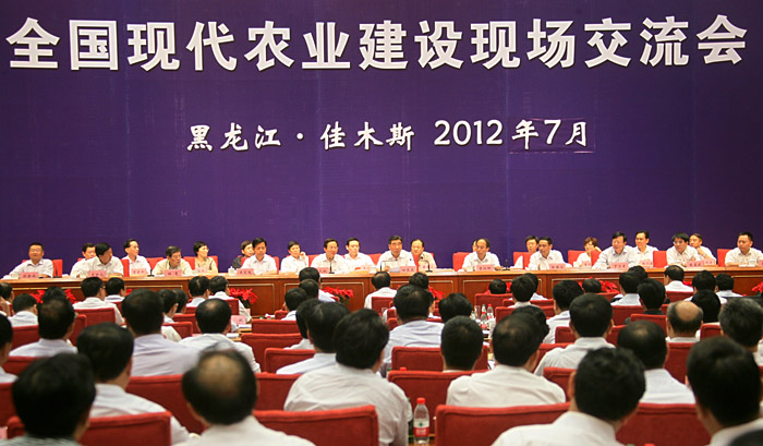 7月19日到20日,国务院在黑龙江农垦建三江管理局和佳木斯市召开全国现代农业建设现场交流会。中共中央政治局委员、国务院副总理回良玉在会上强调,当前我国正处在加快改造传统农业、走中国特色农业现代化道路的关键时刻,要按照中央关于“三化同步”推进的要求,切实把现代农业建设摆在更加突出的位置,认真实施《全国现代农业发展规划》,着力改善农业基础设施和装备条件,大力加强农业科技进步和人才队伍建设,健全现代农业经营制度,完善现代农业支持保护体系,办好全国现代农业示范区,有计划、有步骤地扎实推进现代农业建设,为促进经济社会可持续发展提供有力支撑。