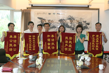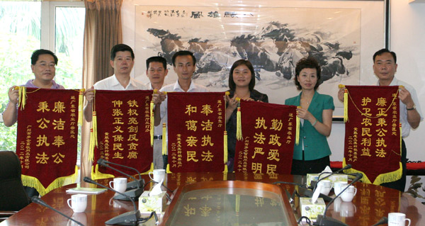 10月17日上午,“从化市联杰兴畜牧用品有限公司销售假疫苗案”举报人张某一行3人,专程到广东省农业厅,向省农业厅及其“三打”部门赠送了“勤政爱民、执法严明”、“奉洁执法、和蔼亲民”等锦旗,感谢省农业厅领导高度重视他们的举报线索,有效督促查处了“从化市联杰兴畜牧用品有限公司销售假疫苗案”及其相关责任人员,认为省农业厅心系群众呼声,为民伸张正义。程萍副厅长和厅“三打”工作小组有关人员参与了接旗仪式。