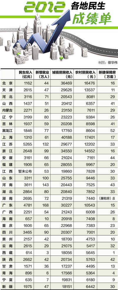 在就业方面,从各省份公布的2012年城镇登记失业率看,绝大多数省份集中在3%—4%之间,普遍低于各地年初确定的目标。从就业人数上看,广东、河南、山东等人口大省处于第一梯队,2012年城镇新增就业人数均在100万人以上。