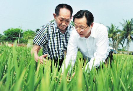 昨日,农业部部长韩长赋来到国家杂交水稻工程技术研究中心海南南繁基地,与杂交水稻之父袁隆平共同宣布超级杂交稻第四期攻关启动。