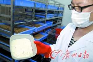 在广东省昆虫研究所蝇蛆培养室,记者看到,数十个铁盘整齐地排列在架子上,铁盘中铺满黑色饲料,用手一拨,便能看到埋于饲料之中不停蠕动的蝇蛆。而在成虫室,一个个1米多高的纱网中,许多苍蝇正在飞舞。