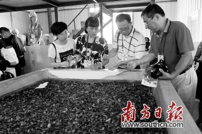 专家在罗坑镇的雪花岩公司参观茶叶生产加工现场。南方日报记者 李细华 摄