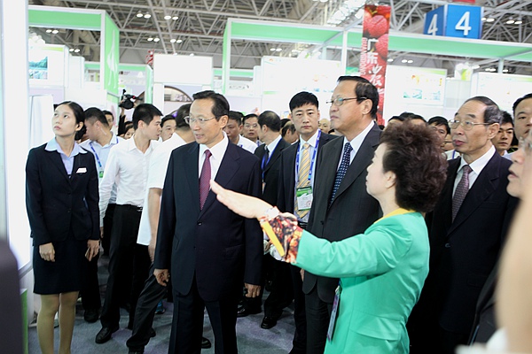 7日上午,第十三届中国国际农产品交易会开幕前,全国人大常委会副委员长张宝文、农业部部长韩长赋到农交会现场巡馆。图为广东省农业厅副厅长程萍向张宝文副委员长、韩长赋部长介绍农交会广东展区情况。
