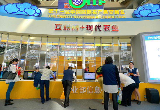 “互联网+”元素和现代元素的凸显,也是本届农交会的亮点之一。主展馆设置了“互联网+现代农业”展区,这里不仅汇集了一批农业互联网解决方案提供商,还展示了农村综合信息服务平台。本网记者 刘刚摄