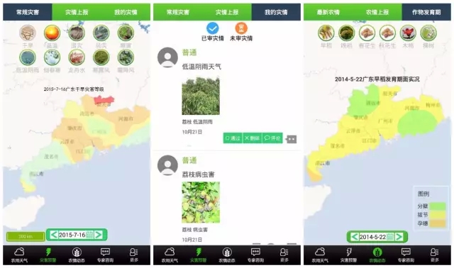 农情动态监测,同样也提供双向服务,气象部门发布全省水稻、花生、木棉、楝树四种作物的发育实况,用户也可以发布所种作物的发育情况。互动交流平台,为用户和农气专家提供了一个互动交流的平台,以便了解用户的需求,提供更专业的服务。