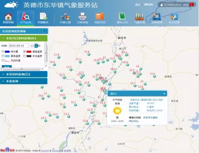 该系统提供的服务信息包括农用天气服务、农业气象灾害监测预警服务、农情动态监测、互动交流平台等四个部分。通过农用天气服务,可查询广东省每天的基本天气实况(气温、降水、日照);获取未来7天的农用天气预报,包括针对水稻、花生、荔枝、龙眼、花卉、沙田柚等作物的农用天气预报,针对石斑鱼、金鲳鱼、对虾等水产养殖的寒害等级、高温等级、放苗等级预报,针对作物播种、移栽、施肥、喷药、晾晒等农事活动的气象条件等级预报,以及水稻病虫害气象条件等级预报。农业气象灾害监测预警服务,主要针对10种广东省常见的农业气象灾害(干旱、高温、涝灾、风灾、寒害、低温阴雨、倒春寒、龙舟水、寒露风、霜降风)提供双向服务。出现农业气象灾害时,一方面,气象部门向用户发布监测预警信息,另一方面,用户可以通过本系统进行灾害调查,及时上报所辖农田的受灾情况。