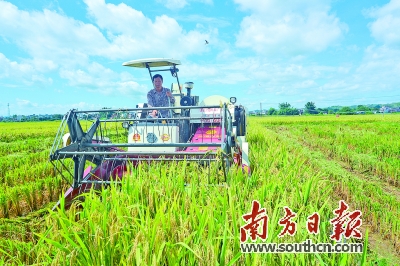 烈日炎炎,140亩示范基地内,超级稻在田间表现生长平衡,穗大穗多,籽粒饱满,工作人员正在收割(如图)。中国工程院院士罗锡文来到梅州市兴宁市,为袁隆平团队主持的“华南双季超级稻年亩产三千斤全程机械化绿色高效模式攻关”项目进行早造测产验收。