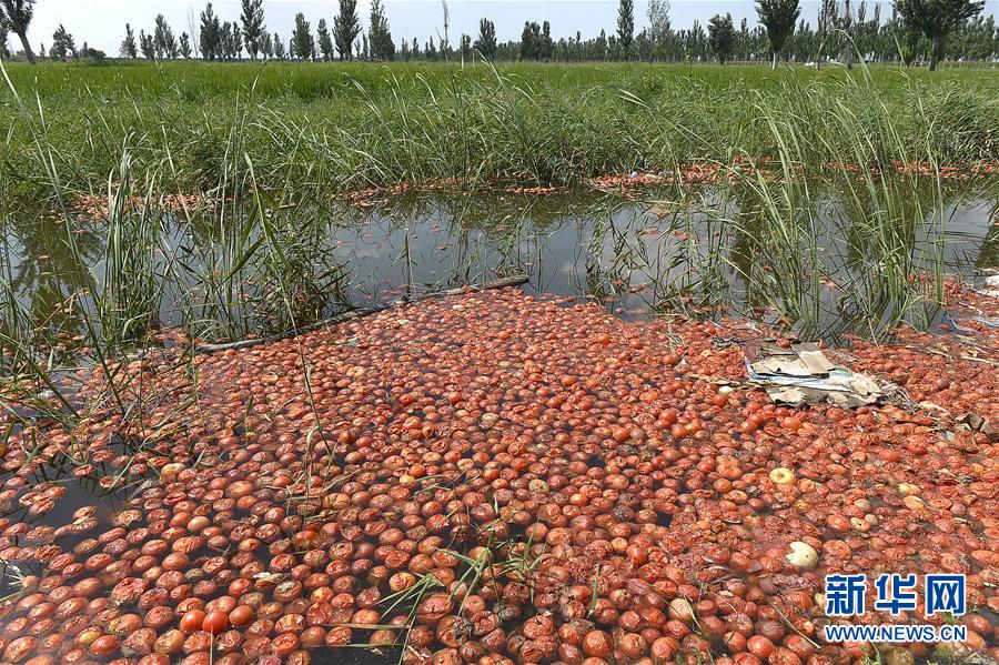在宁夏灵武市梧桐树乡陶家圈村,田边的沟渠内密布着农户因为滞销而倾倒丢弃的西红柿(8月2日摄)
